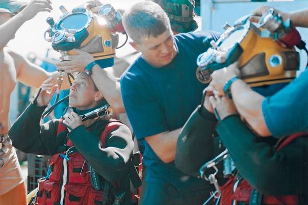 Lieutenant Karin Lynn preparing to don the Mk 12 dive helmet in the swimmer’s mode with a harness during training at Basic Diving Officer training, Naval Diving and Salvage Training Center, Panama City FL in 1983. Photo courtesy of Karin Lynn.
